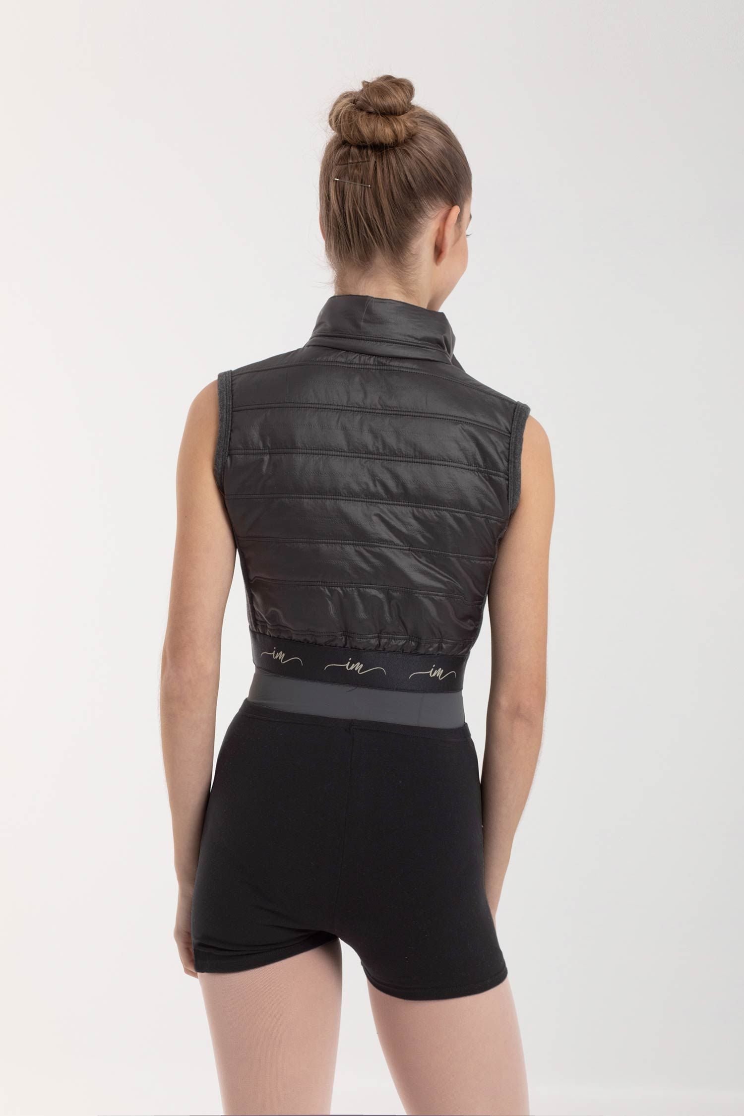 Crop padded vest combined with plush fabric on the sides and elastic with Intermezzo logo at the waist. Front zipper and high neck. Side pockets. Made in Spain.