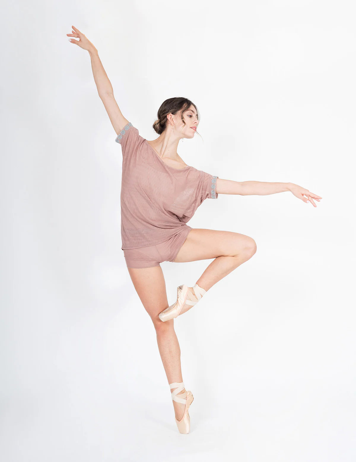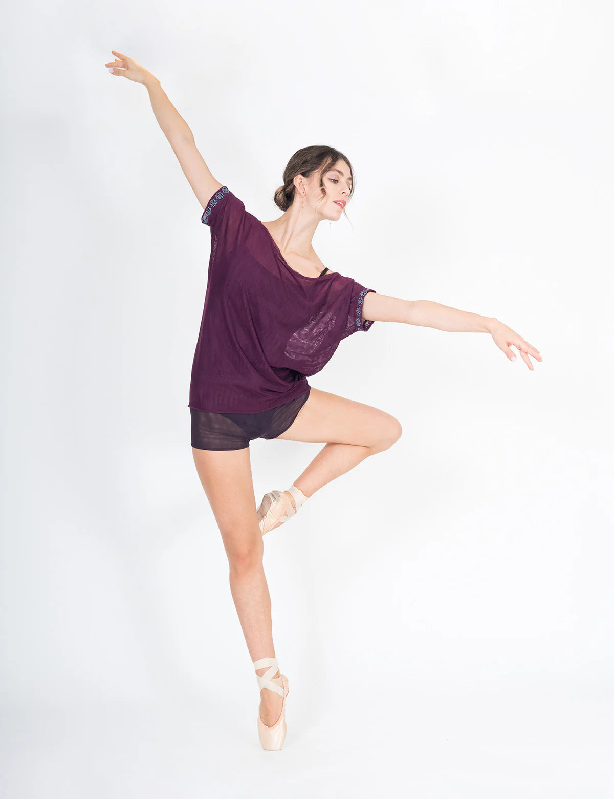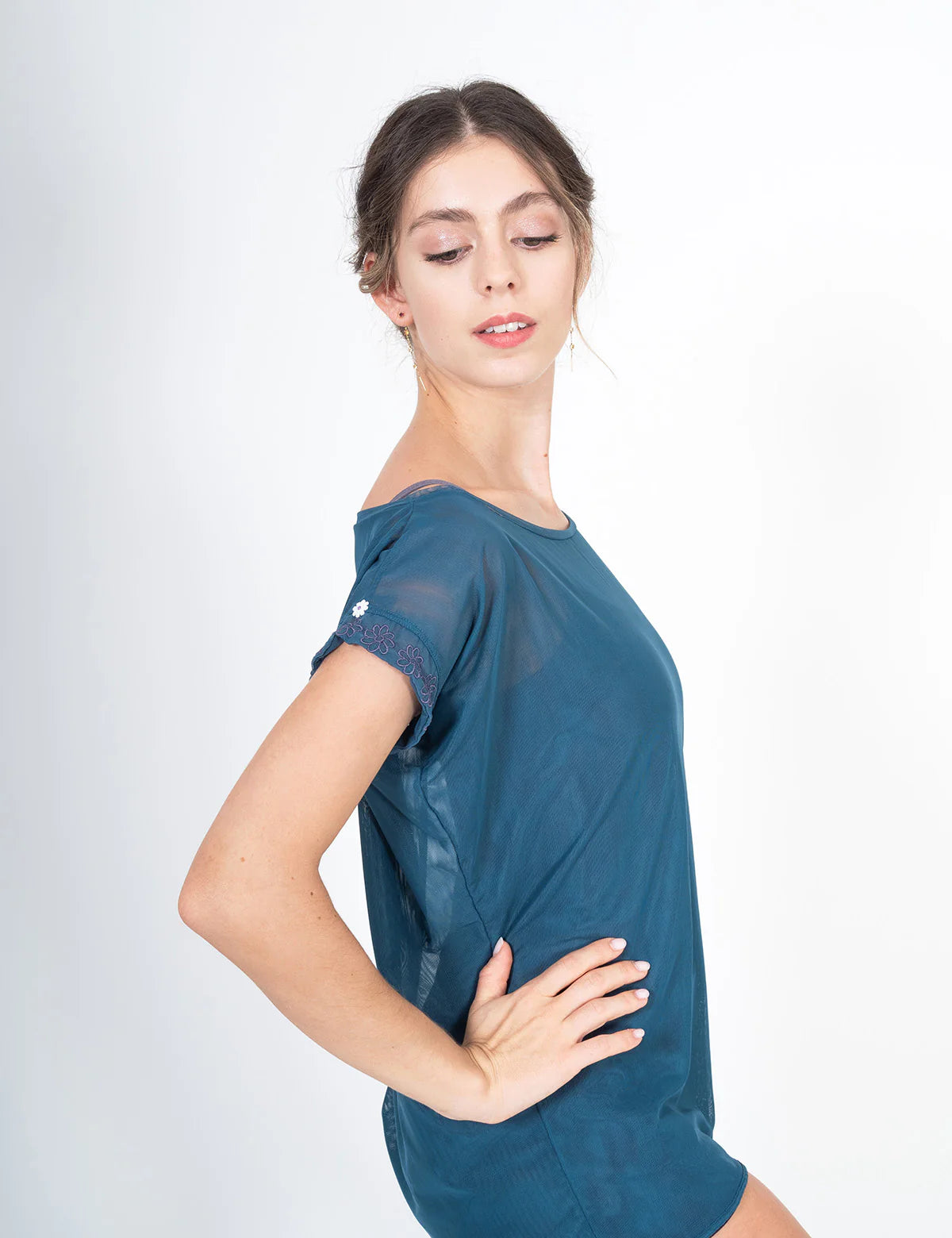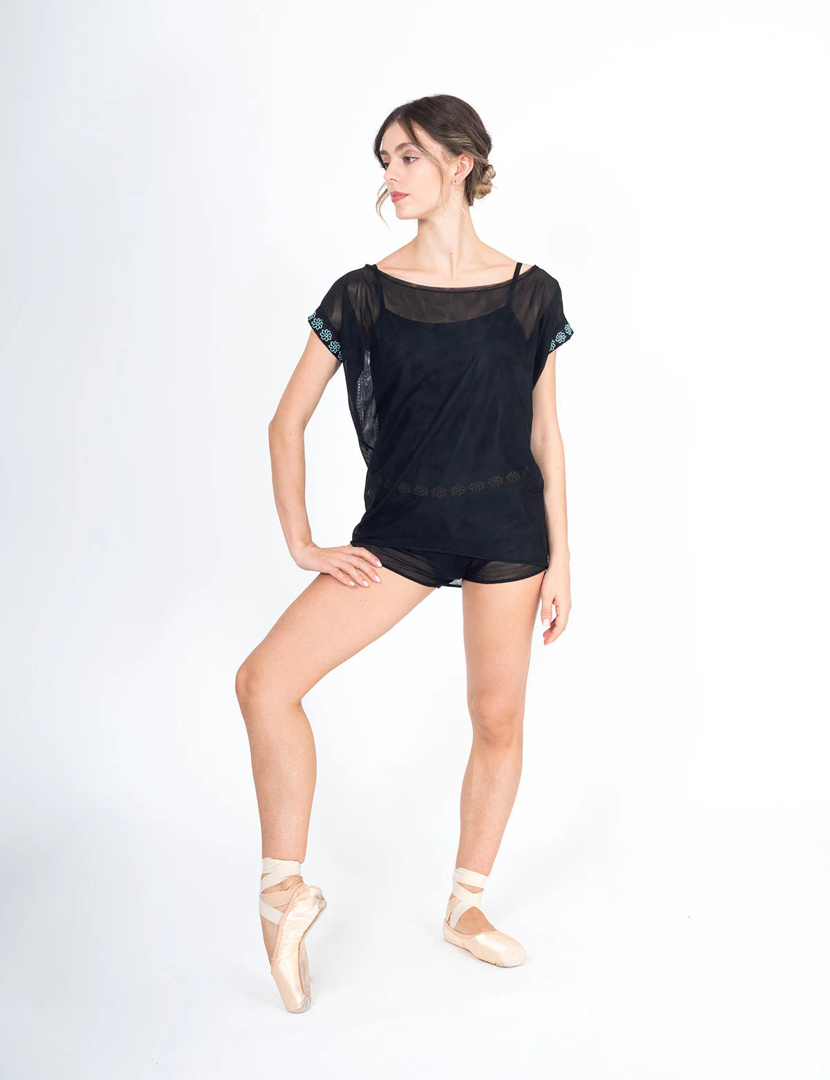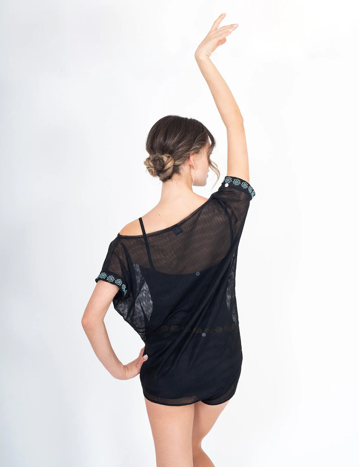 Daisy Blouse is a chic and comfort layering piece. Made in a soft tulle, it is perfect to be worn over your leotard or to be paired with Daisy Skirt or Daisy Shorts. Daisy Blouse features short sleeves and wide boatneck line to ensure any kind of movement and embroidered daisies for a perfect DellaLo' style.