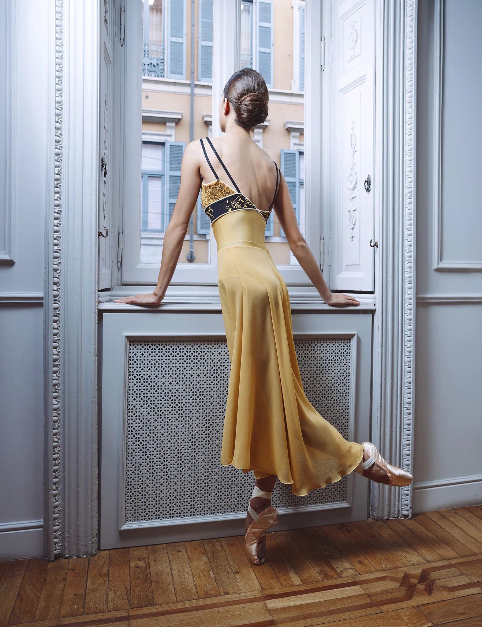 The Brigid GL leotard is a true masterpiece, showcasing a harmonious blend of fabrics and design elements. The viscose lace bodice, adorned with a wide embroidered tulle belt featuring DellaLo’s signature daisies, creates a delicate and feminine look. The double strap design adds a touch of intrigue, offering a sinuous, almost backless effect.