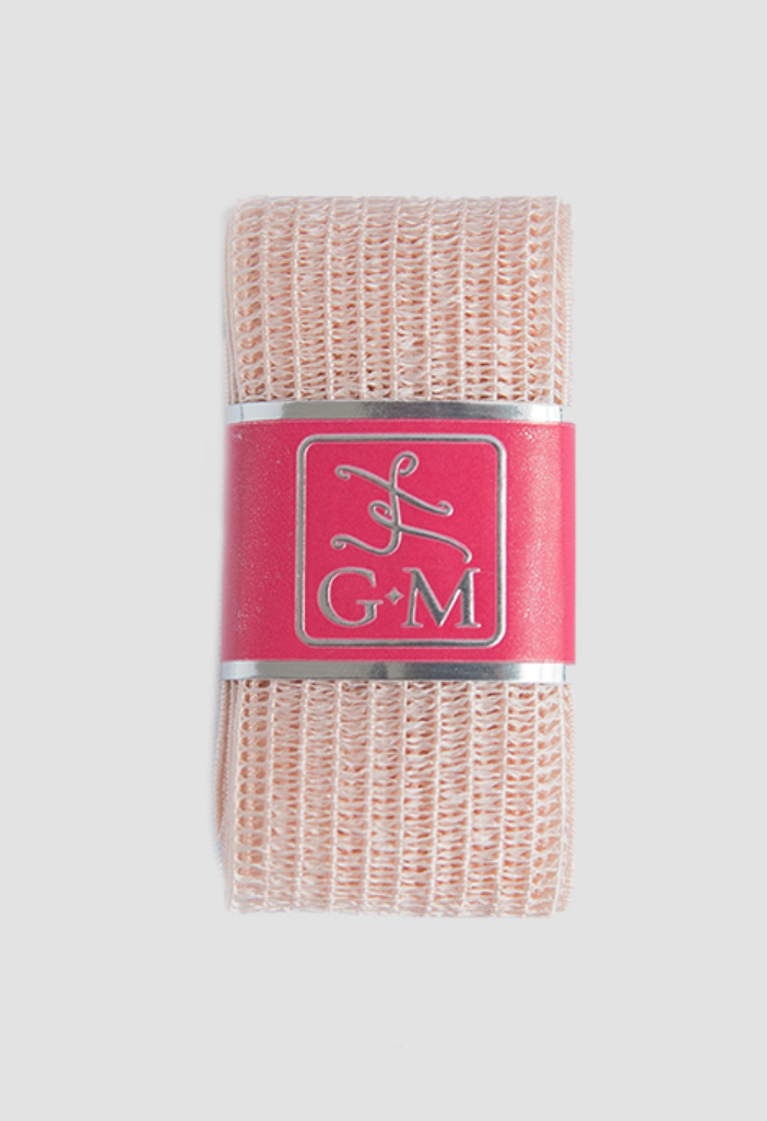 Lace-like stretch material that virtually disappears next to tights. Works for technique slippers, too. Ample (30″) for two pairs of shoes.