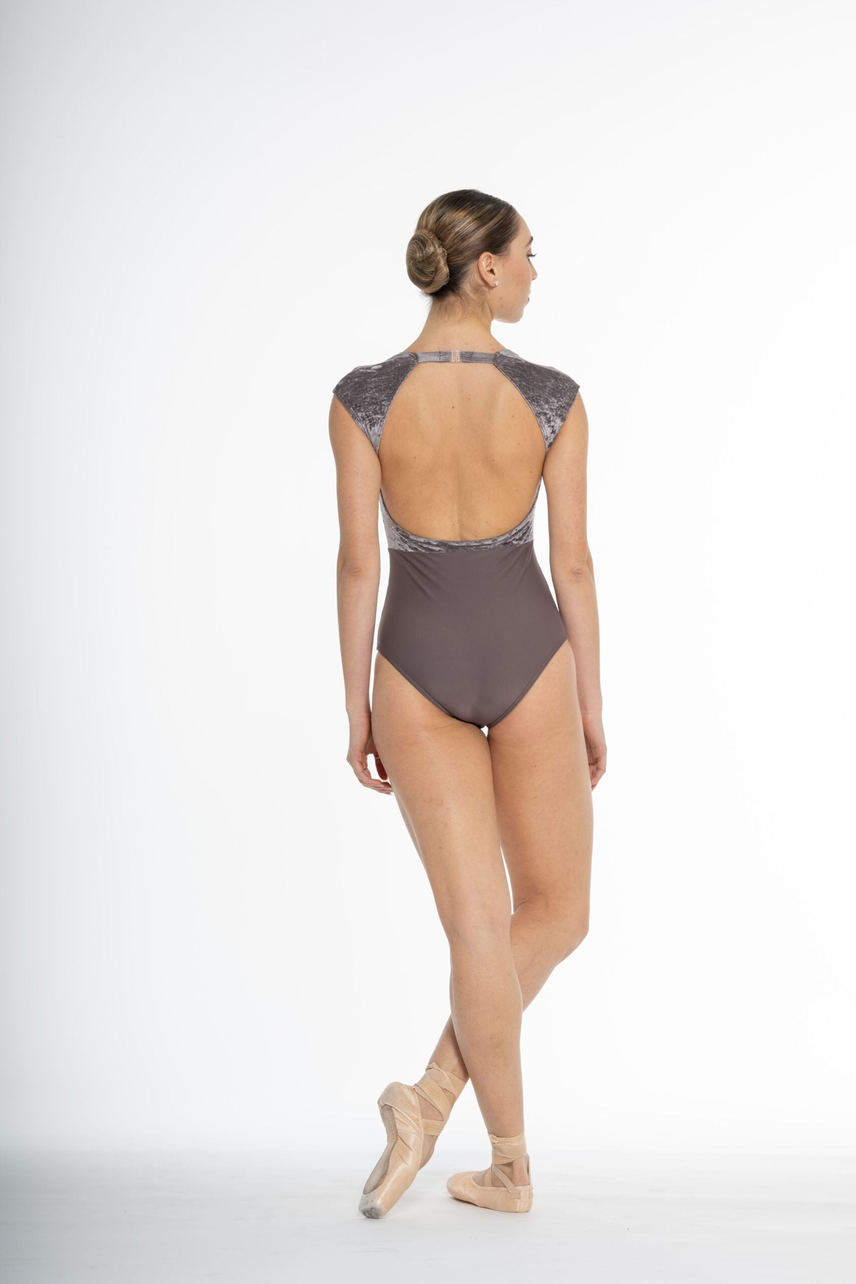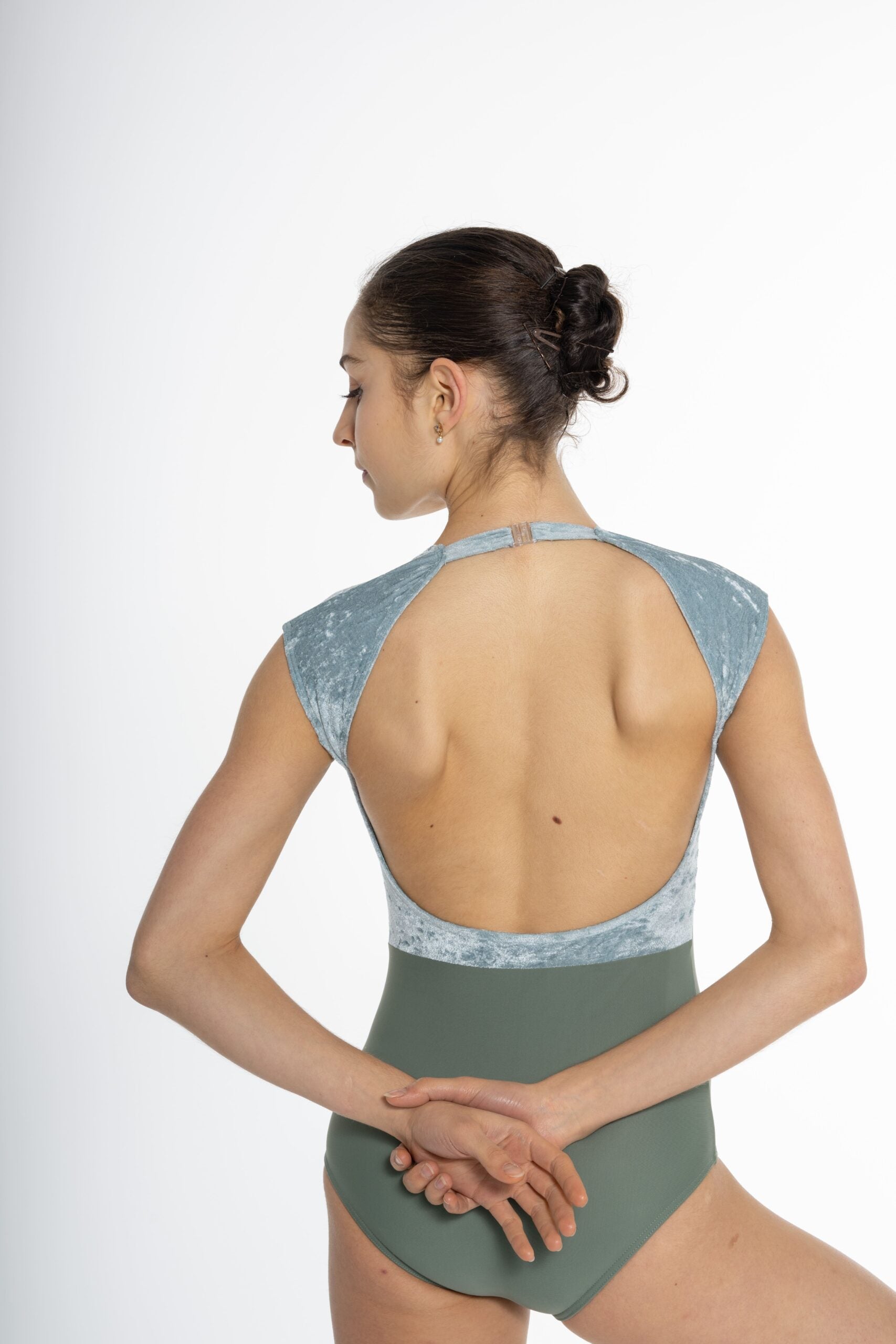 Leotard with very feminine details in crinkled velvet and tone-on-tone matte lycra.