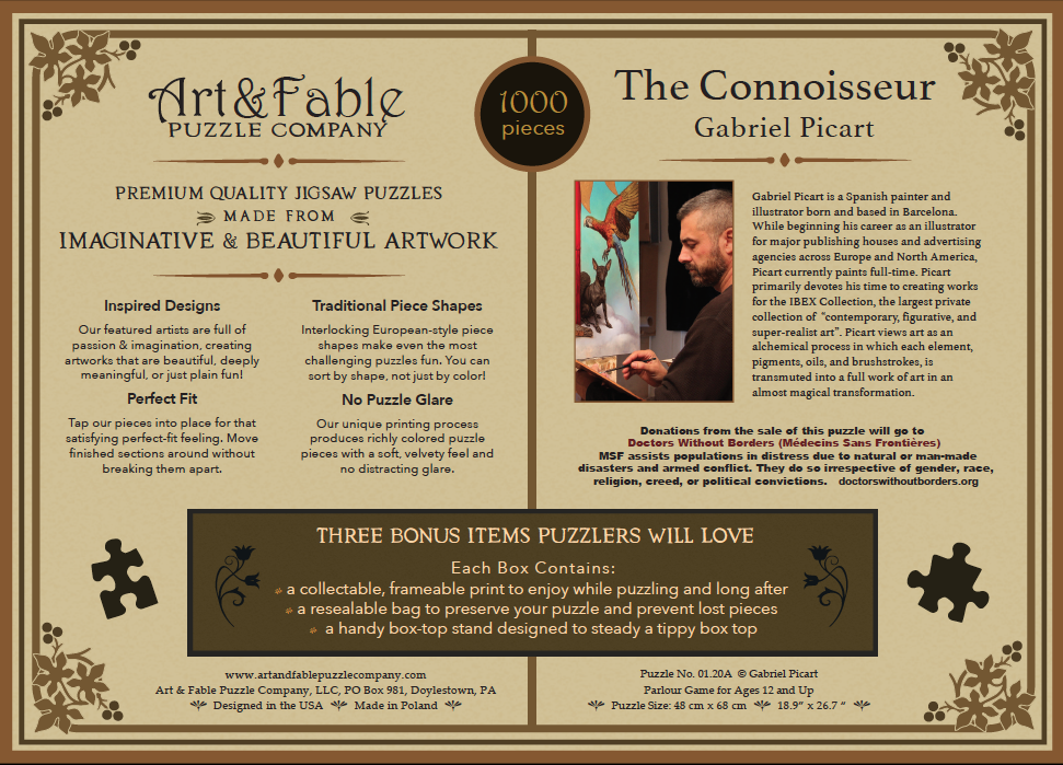 About Art & Fable Puzzle Company: The Art & Fable Puzzle Company was forged with purpose. Our work began even before our company was fully realized, aiming to expand the audience of hard-working artists and to bring attention to the beautiful illustrations and stories of forgotten fables. Our approach towards accomplishing this goal, was to create premium quality jigsaw puzzles while simultaneously contributing to charity.