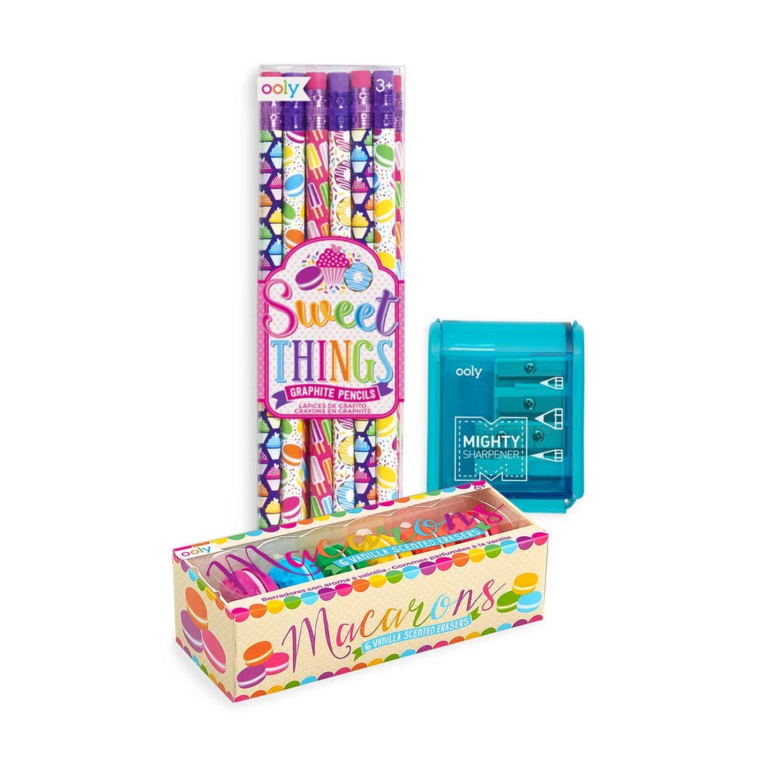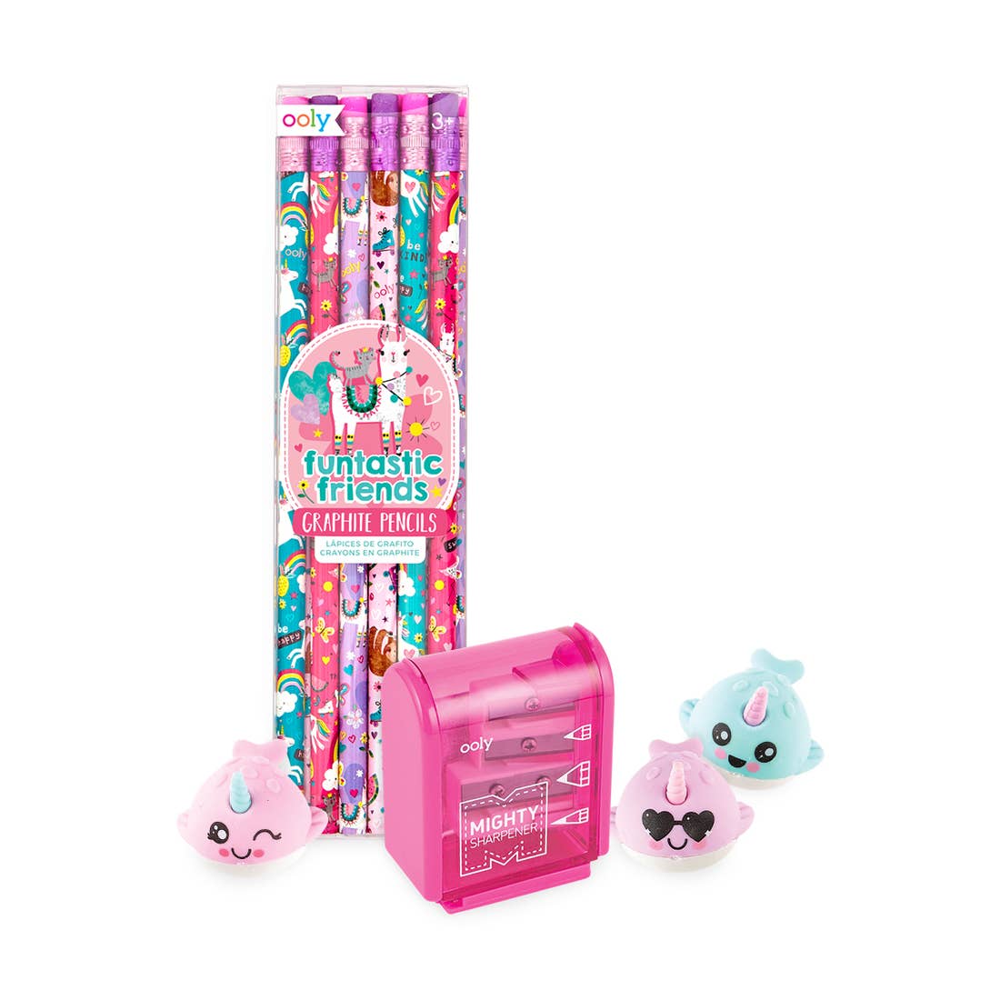 Narwhals & Friends Happy Pack includes: Narwhal erasers, 12 Funtastic Friends graphite pencils, Sharpener